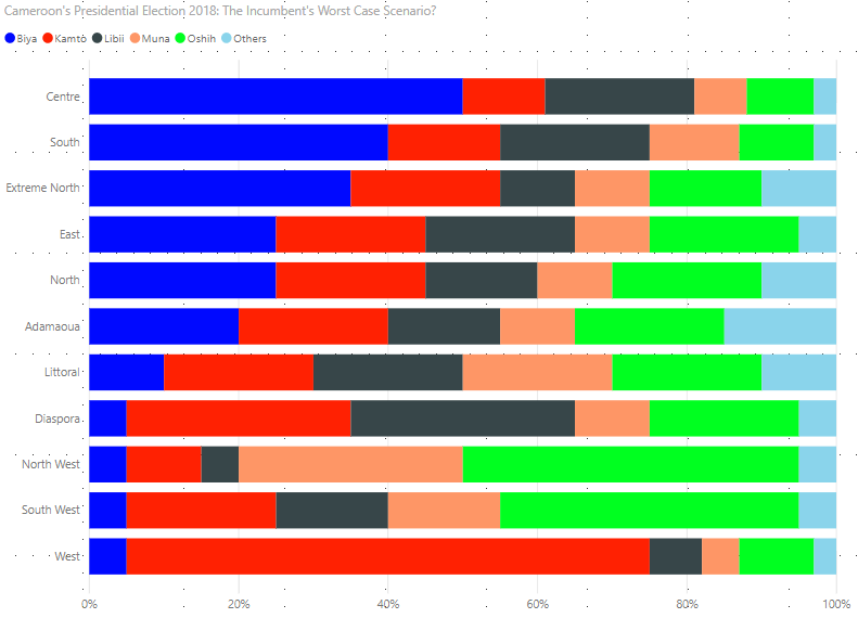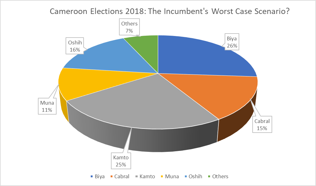 It also a no-brainer that Mr. Osih and Mr. Muna are taking votes from each other and ostensibly, a coalition between the two would stand to reason, yet, from the simulation, would not win either the poll as they each or both need a coalition with francophone candidate(s) to keep their vote-share and broaden their appeal.